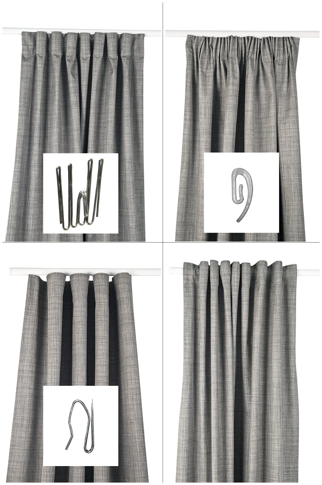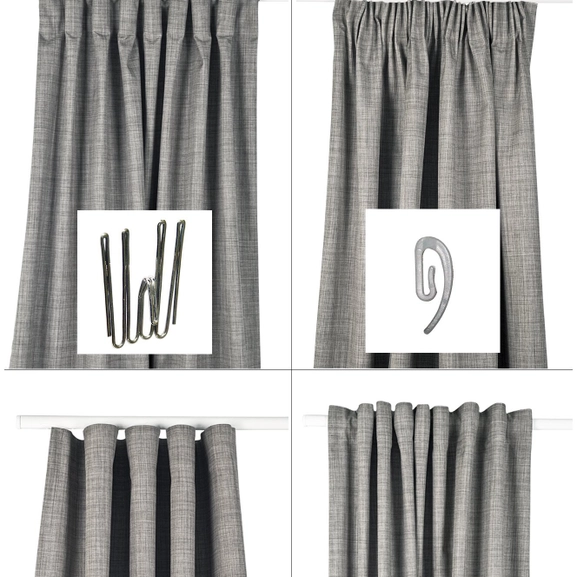 The curtain features Hasta’s multi-purpose curtain tape, which means that you can set up the curtain in four different ways – the modern wave setup for hotel waves, pleated curtain with deep pleat hooks, beautifully gathered curtain with wave/rufflette hook and directly onto the rod using ready to hang loops.