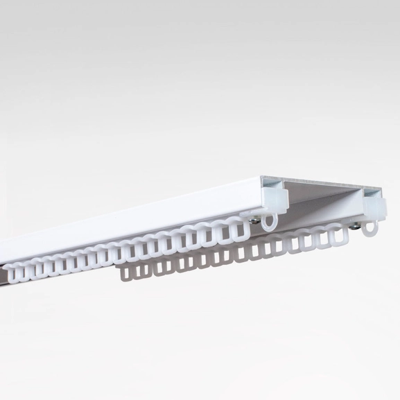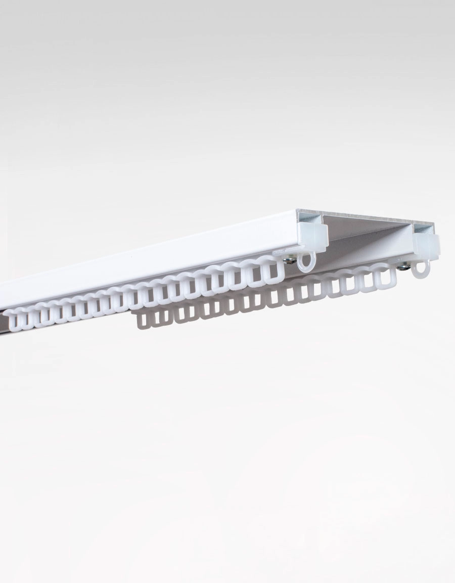 Suitable for light, medium and heavy curtains. No brackets necessary, the rail comes with predrilled holes and attaches straight to the ceiling with screws. 65 mm between the tracks and the rail measures 91 mm in total depth.